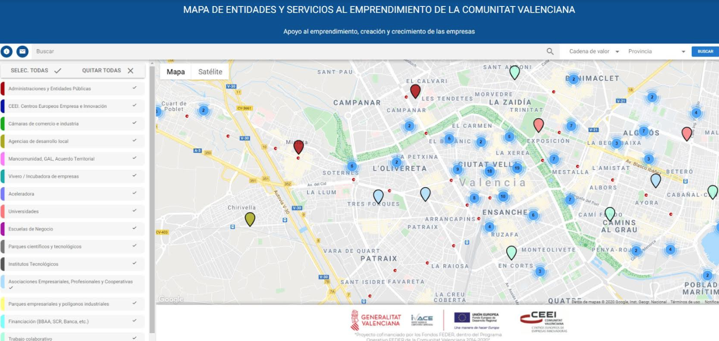 El Mapa de Ecosistema de Emprendimiento de la Comunitat Valenciana se ha convertido en un elemento fundamental de consulta e información para personas emprendedoras y pymes de la Comunitat Valenciana. La finalidad del mapa es dar a conocer qué entidades del ecosistema valenciano prestan servicios de apoyo al emprendimiento en sus diferentes fases: creación, crecimiento y consolidación. Cada una de las entidades se encuentran geolocalizada para que los interesados puedan contactar directamente con ellas en función de sus necesidades y de la cercanía a sus respectivos entornos.