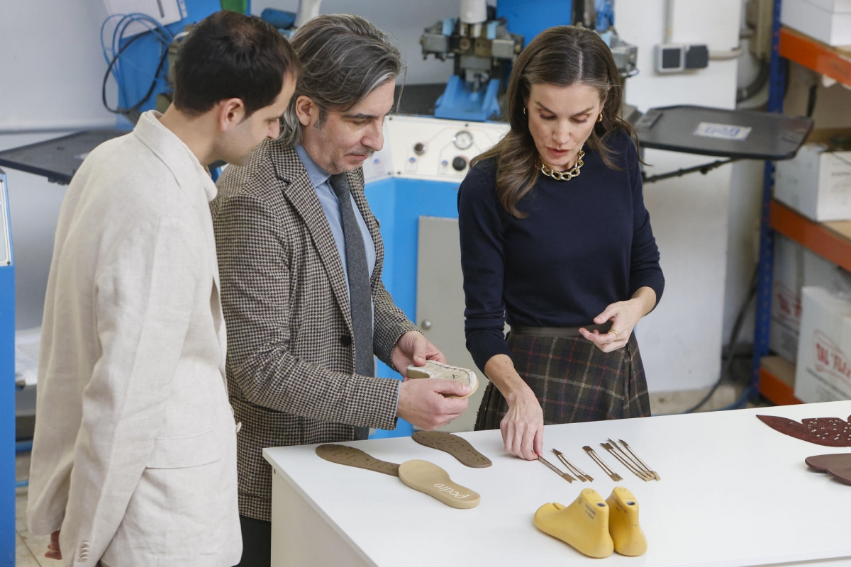 La reina es cliente habitual de botas y sandalias de Pedro García y, acompañada por los actuales directivos de la tercera generación, Pedro y Mila García, ha conocido directamente y preguntado por la actividad de todos los departamentos de la fábrica, desde el pequeño estudio de diseño a la zona de corte y producción, donde le han enseñado el minucioso trabajo a mano.