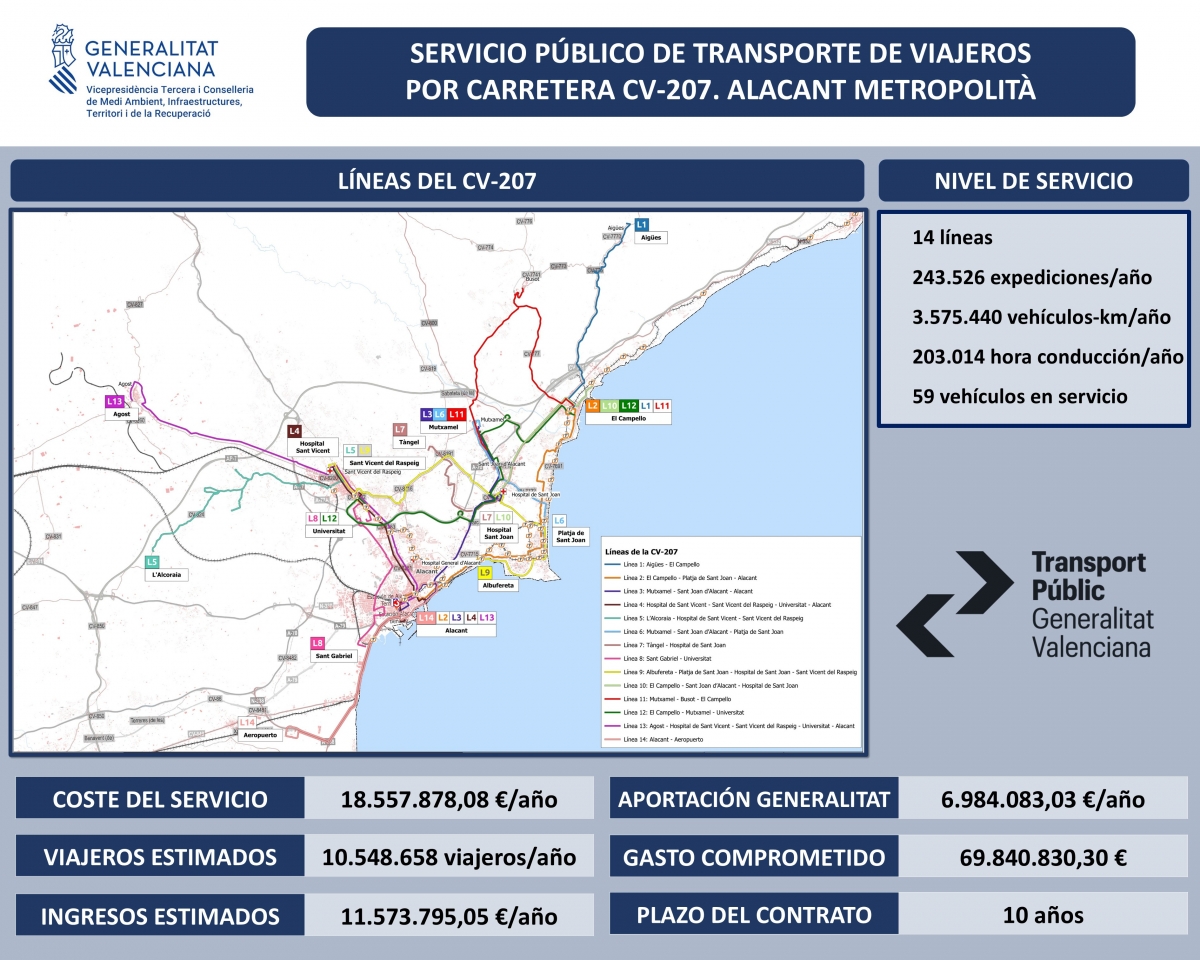 Las nuevas líneas se integran en el sistema de Transporte Alicante Metropolitano (TAM) que unifica los autobuses urbanos e interurbanos de Alicante y su área metropolitana. Ahora se abre un plazo de alegaciones para que los diferentes ayuntamientos que se ven beneficiados, cuyos representantes han estado presentes, hagan sus propuestas de mejora de cara a poner en marcha el servicio.