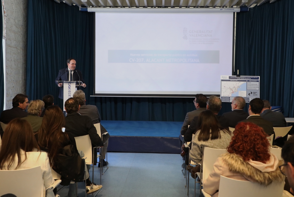 ALICANTE. El president de la Generalitat, Juanfran Pérez Llorca, ha subrayado la apuesta del Gobierno valenciano por la red de transporte público metropolitano en la comarca de L’Alacantí, con la puesta en marcha de la renovación del servicio de autobús “más rápido y eficiente” que atenderá las necesidades de más de 510.000 habitantes y en el que la Generalitat invertirá de forma directa 70 millones de euros, de los 185 que supondrá el coste total del servicio durante los próximos diez años.