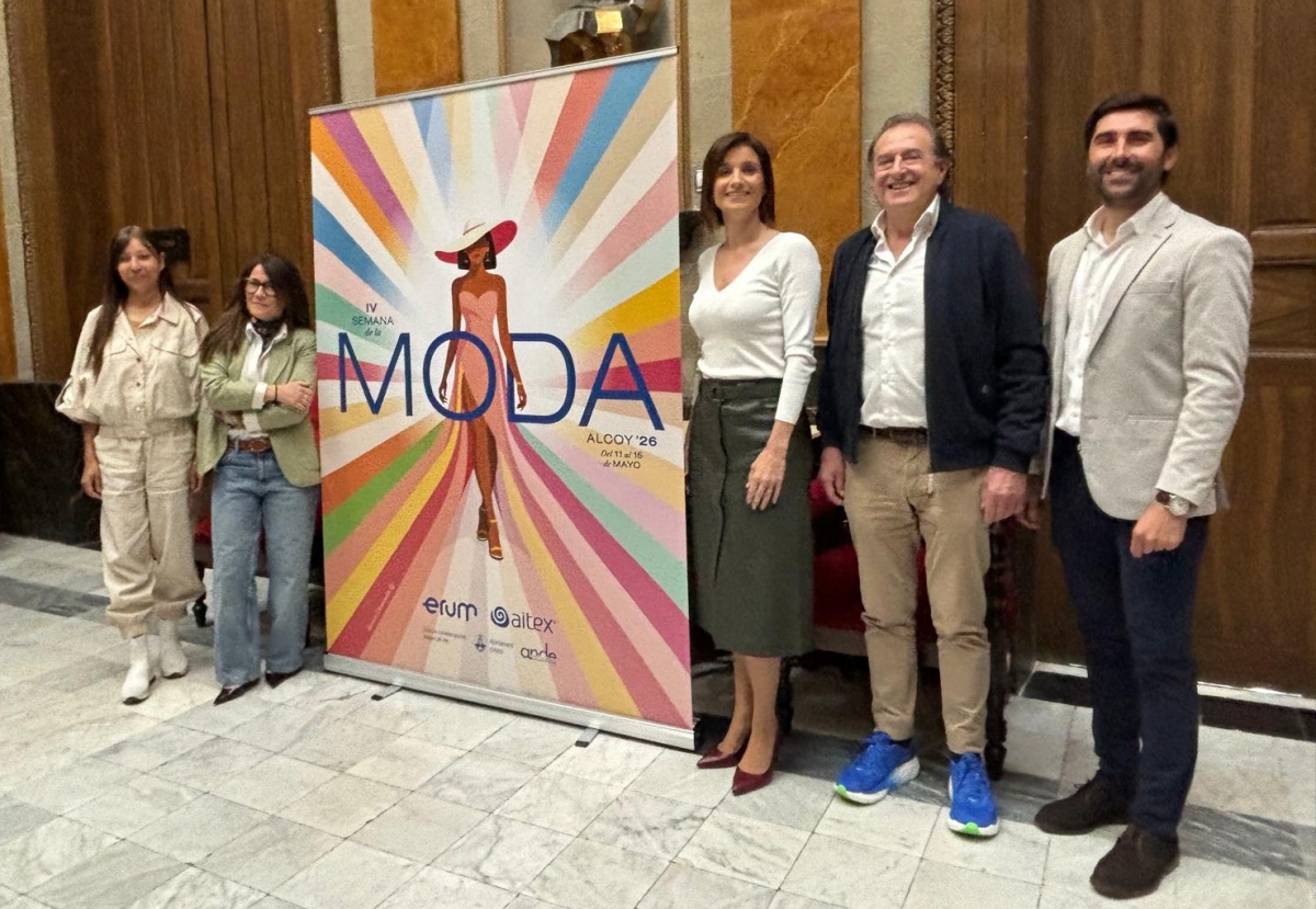 ALCOY. Alcoy se prepara para celebrar la IV Semana de la Moda, que tendrá lugar del 11 al 15 de mayo y que busca dar visibilidad al talento emergente local y a la tradición textil de la ciudad. Este miércoles ha tenido lugar la presentación, de la mano de la concejala de Turismo, Lorena Zamorano; el director general de Aitex, Vicente Blanes; la CEO y representante de Erum Group, Coral Erum; la representante de la Asociación de Jóvenes y Nuevos Diseñadores Españoles ANDE, Natalia Pallás; y el diseñador del cartel del evento, Ignacio Doménech.