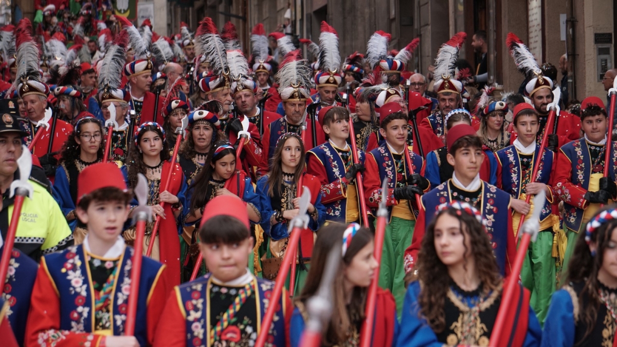 Entre los dos cargos han ido desfilando los festeros y festeras del resto de filaes, Abencerrajes, Mudéjares, Ligeros, Cordón y Magenta, llegando a los Verdes, que este año ostenta el Mig por el bando moro, lo que le otorga el derecho a una escuadra especial, algo que siempre es agradecido por el público al aportar un diseño creado a propósito. Tras el Mig, las filaes Chano, Domingo Miques, Judíos, Llana, Benimerines y Berberiscos han ido aportando sus tropas. Apuntar que la filà Llana es la del niño que ocupa Sant Jordiet, Mateo Vilaplana Blaak, quien ha desfilado en una carroza especial, y será este domingo cuando saldrá por primera vez a la calle vistiendo el diseño del cargo.