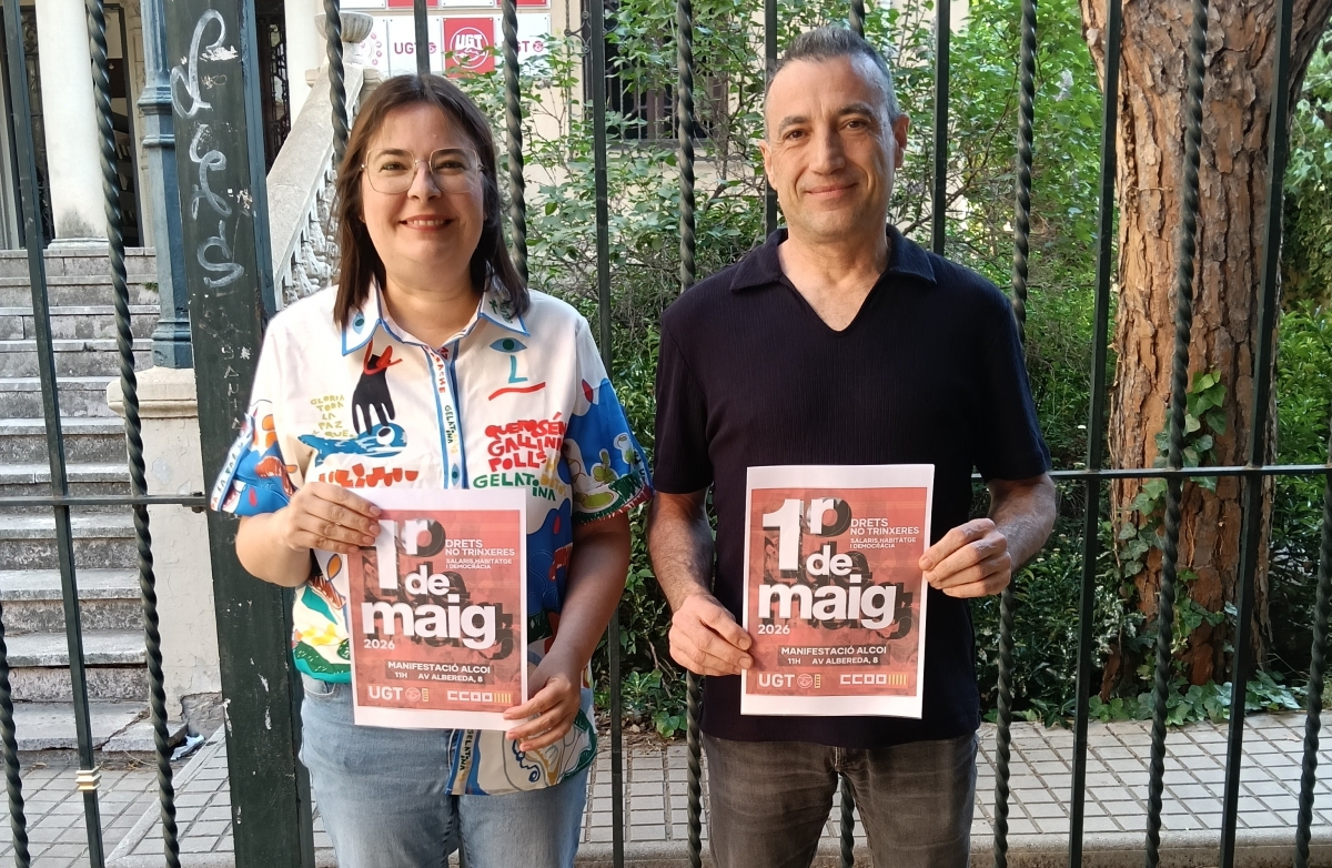 ALCOY. Las organizaciones sindicales UGT y CCOO han convocado de manera conjunta en Alcoy los actos del Primero de Mayo, con un llamamiento a la participación de la ciudadanía de estas comarcas y bajo el lema 'Derechos, no trincheras. Salarios, vivienda y democracia'.