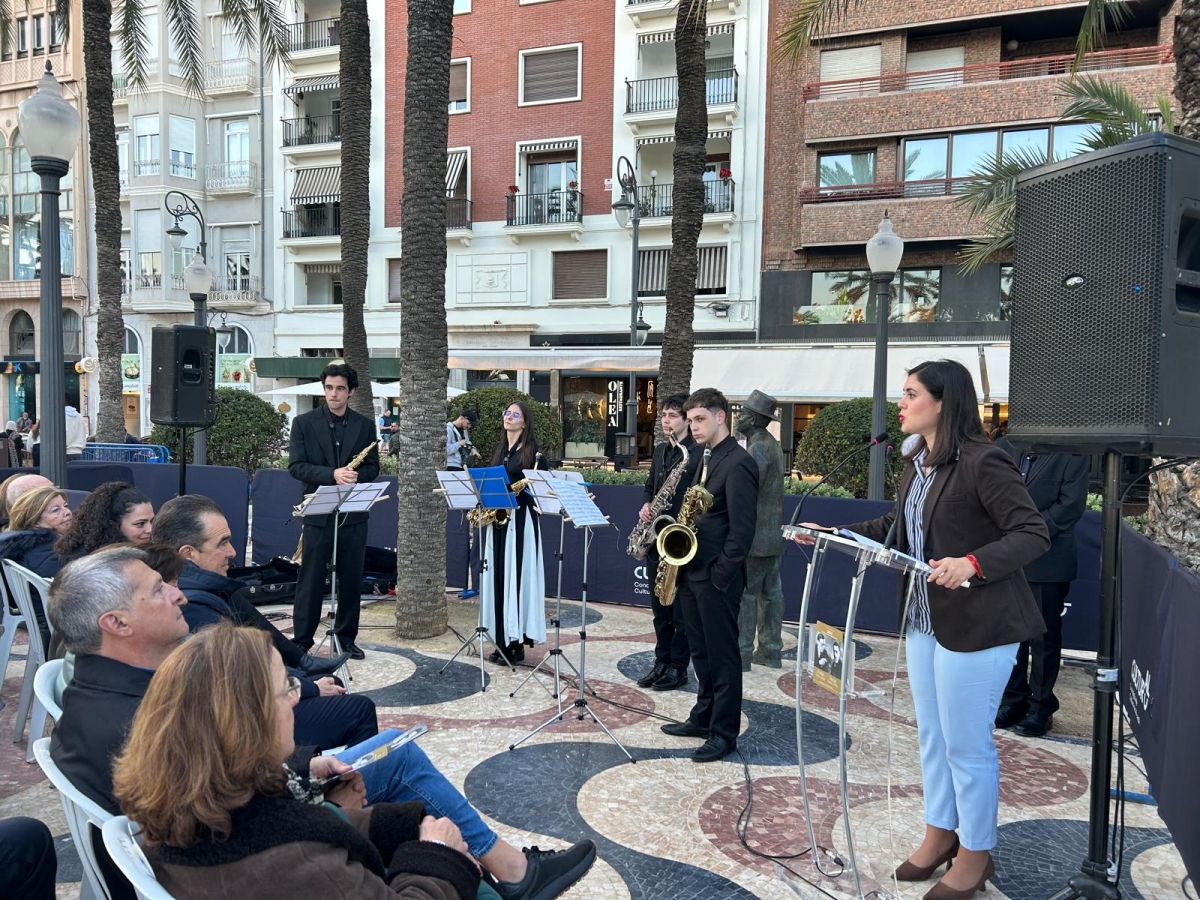 Familiares de Varela y representantes de la cultura local han asistido al acto de reconocimiento que se celebró en la Explanada junto a la estatua del pintor y con el cuarteto de saxofones "Ars Musicandum" del Conservatorio Superior de Música Óscar Esplá interpretando piezas del compositor.