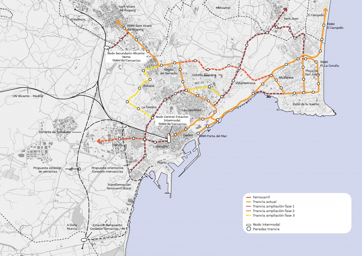 De este modo, se propone "la reconversión de la Gran Vía como eje articulador de barrios, constituyéndose en un cinturón que pueda acoger un elevado número de viajeros, dado que conecta directamente con barrios de alta densidad ya existentes". Además, las mismas fuentes señalan que "el eje de la avenida de Dénia resulta clave dentro de la estrategia de conexión del entorno metropolitano con el centro de Alicante en 15-20 minutos, planteando un Tram lanzadera que enlace de manera directa Sant Joan, el Hospital y la Universidad Miguel Hernández con la Estación Intermodal".