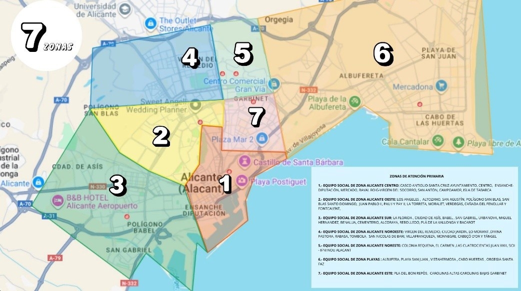 Asimismo, la nueva zona de atención de Alicante Playas, comprende los barrios de Albufera, Playa San Juan, Cabo huertas, Vistahermosa, Orgegia Santa Faz. Esta zona tal y como se explica en el acuerdo, aunque se trata de una zona con alta calidad de vida media, presenta por un lado una gran extensión territorial y distancia del centro urbano y una baja presencia histórica de servicios municipales. Así como una alta población mayor y dependiente, con necesidad de atención cercana, presencia de menores en riesgo y conflictos juveniles emergentes y la necesidad de enfoque comunitario en la zona.
