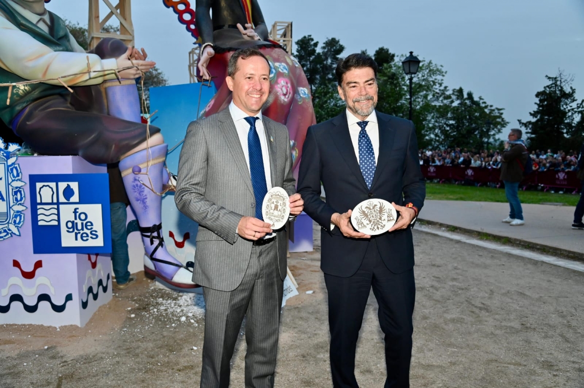Cerca de 10.000 personas se acercaron desde la tarde del jueves al Paseo de Recaredo para ver y fotografiarse junto a las distintas escenas de "Sentir de día, vivir de noche", una hoguera de unos ocho metros de altura, con el remate del logo del Patronato de Turismo Costa Blanca y dos figuras centrales representando a una novia alicantina y a un zaragüell, y con alusiones en sus bajos a las distintas fiestas de Alicante y provincia. Fue plantada ‘al tombe’ por los conjunto de operarios del artista y con la ayuda de la Bellea del Foc 2025, Adriana Vico Melgar, y sus Damas de Honor -María Carrión García, Claudia Aroca Mira, Lucía Gómez Barril, Paula Nicolás Linares, Mireya Gaitán Navarro y Marta Lledó Pérez.