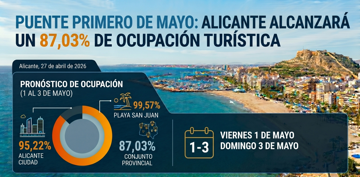 ALICANTE. Los establecimientos dedicados al hospedaje agrupados en la Asociación Provincial de Hoteles y Apartamentos Turísticos de la provincia de Alicante (APHA) encaran el próximo puente del Primero de Mayo con expectativas positivas. Los datos de reservas confirmadas hasta el momento auguran una tasa de ocupación media del 87,03% entre el viernes y el domingo para el conjunto de los asociados, según apuntan portavoces oficiales de APHA.