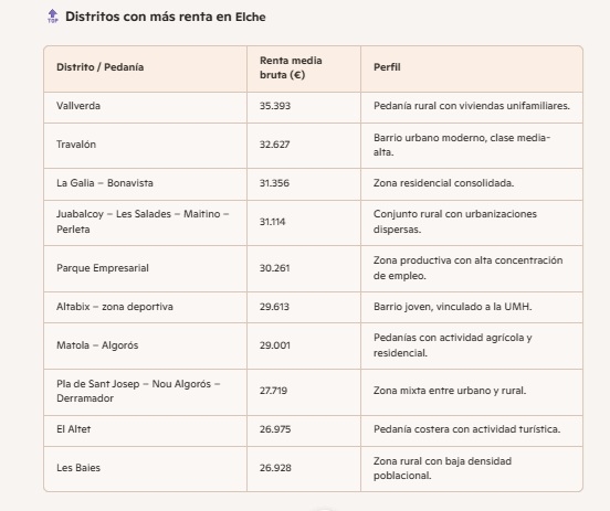 La situación de Elche también presenta una dualidad, entre determinados barrios y las zonas rurales del extrarradio de la ciudad. Según los datos de la Agencia Tributaria, la zona con las rentas más altas es la pedanía de Vallverda, con 35.393 euros por contribuyente. Le sigue el barrio urbano de Travalón, con 32.627 euros. Después iría el barrio de La Galia-Bonavista, con 31.356 euros.