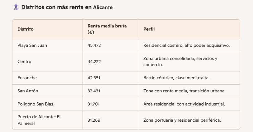 Los distritos más acomodados se concentran en la zona norte y costera: Centro (44.222 euros) y Ensanche (42.351 euros) siguen de cerca a Playa San Juan, reflejando un perfil urbano con mayor poder adquisitivo. En contraste, zonas como San Antón (32.431 euros), Polígono San Blas (31.701 euros) y Puerto de Alicante-El Palmeral (31.269 euros) muestran rentas significativamente más bajas dentro de los distritos con mayores retribuciones.