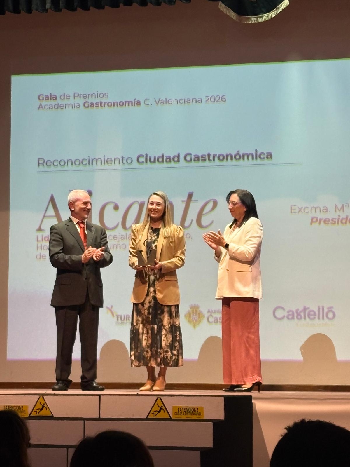 ALICANTE. Alicante ha recibido este lunes un Premio de Gastronomía de la Comunidad Valenciana por su difusión, excelencia y proyección internacional como Capital Española de la Gastronomía durante el 2025, en una Gala celebrada en el Orenes Gran Casino de Castellón, según informan fuentes municipales, a través de un comunicado. La concejala de Hostelería del Ayuntamiento de Alicante, Lidia López, ha acudido a la gala para recibir de la Academia Gastronómica el galardón, en un acto en el que se ha mostrado "orgullosa" para destacar que "la capitalidad ha significado una oportunidad única para impulsar la proyección internacional de nuestra ciudad como destino gastronómico, la excelencia y calidad de nuestros productos, el talento y profesionalidad de los chefs, la tradición de nuestra cultura gastronómica y al sector con el que compartimos este premio porque ellos son los verdaderos protagonistas del reconocimiento".