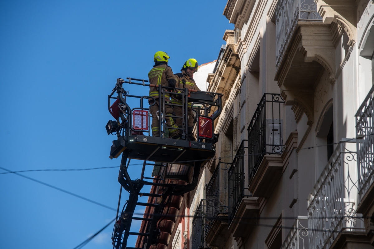 ALICANTE. El desprendimiento de un fragmento de la cornisa de un edificio de la calle Mayor de Alicante ha obligado este lunes a los efectivos del Servicio de Extinción y Prevención de Incendios (SPEIS) a cerrar temporalmente el paso en esa vía peatonal con el fin de sanear el punto en el que se ha producido la caída de cascotes.