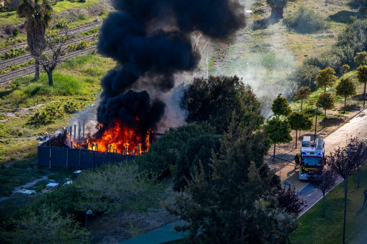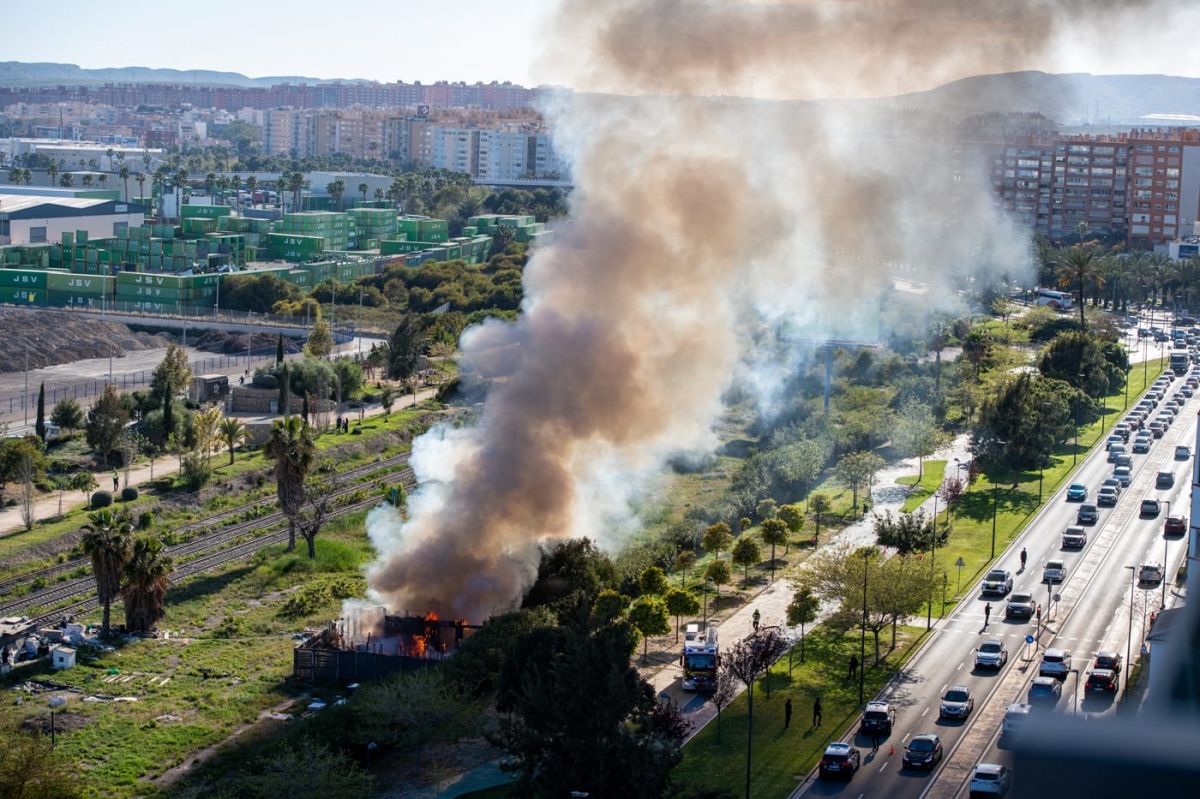 Aunque no ha sido necesario cortar los accesos de la Avda de Elche, la rápida actuación de los Bomberos de Alicante ha evitado que el fuego se transmitiera a otros puntos, como los jardines del Parque de Mar o la parte trasera de Casa Mediterráneo.