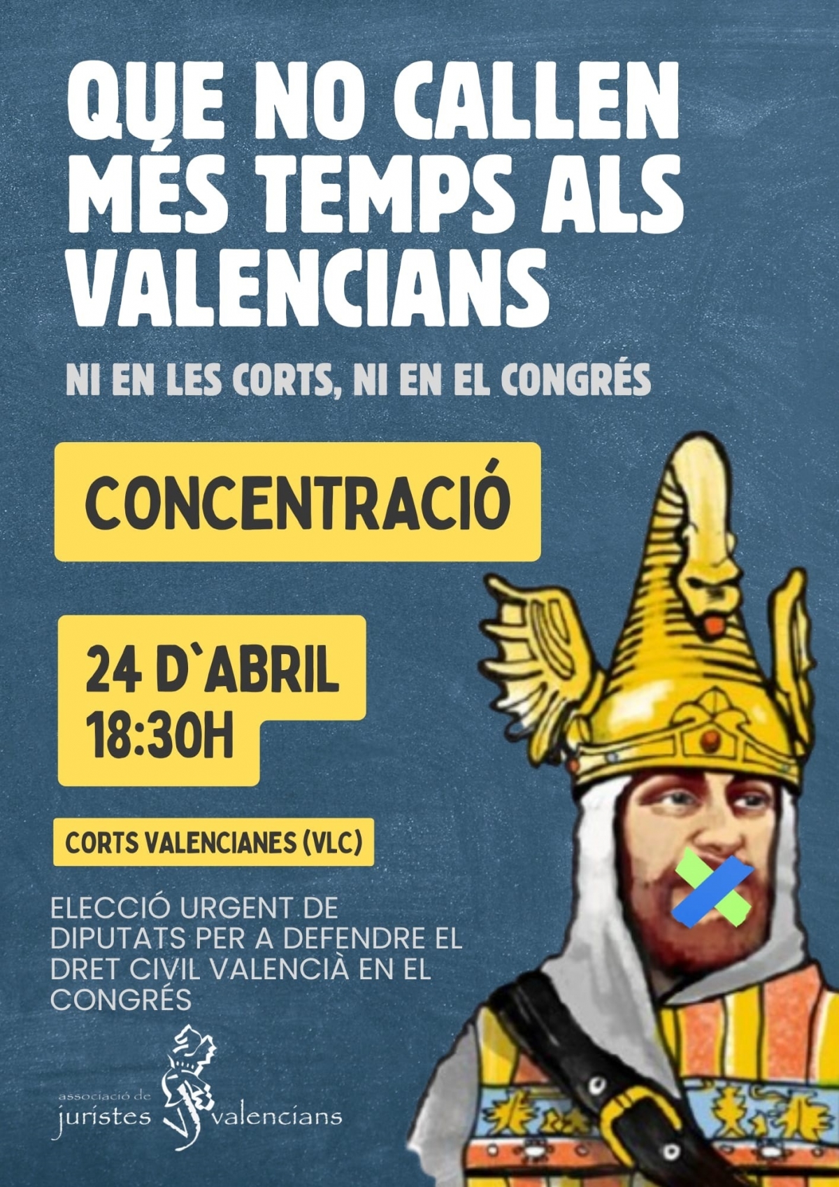 VALÈNCIA (EP). La asociación Juristes Valencians ha convocado una concentración este viernes 24, víspera del 319 aniversario de la Batalla de Almansa, ante Les Corts a partir de las 18.30 horas con el objetivo de denunciar el riesgo de que fracase una iniciativa de carácter ciudadano como la recuperación del derecho civil valenciano "debido a la inacción del Grupo Parlamentario Popular".