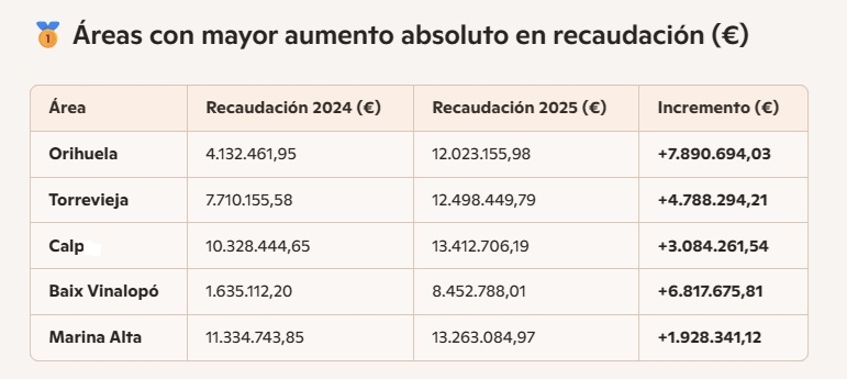 En la Marina Alta, el incremento ha sido cercano al 20%. La oficina de Dénia que incluye a los municipios de su entorno (a excepción de los de Calp y Xàbia), ha recaudado 13,2 millones frente a los 11,3 de los primeros meses de 2024. Y por último, los municipios de l'Alcoià-El Comtat, donde la recaudación casi se ha duplicado al pasar 968.000 euros a los 1,7 millones.