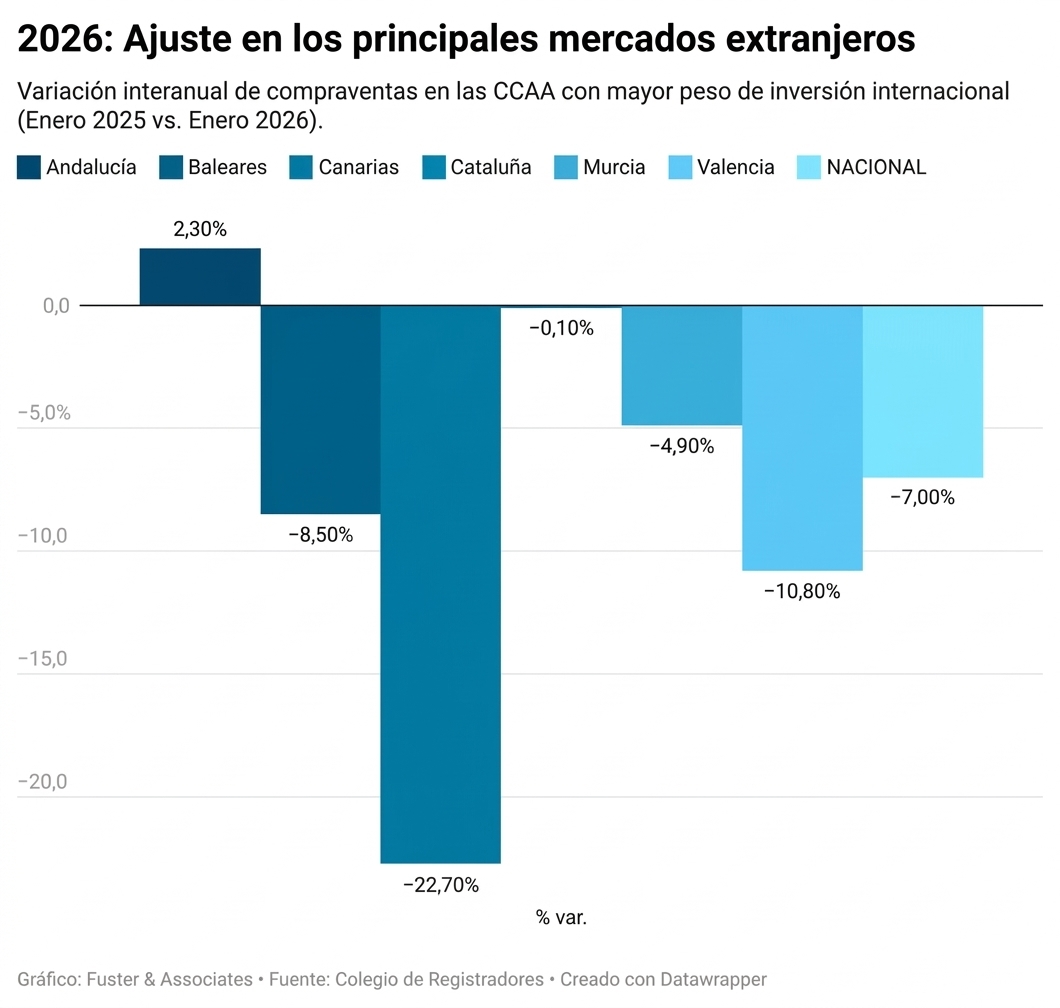 Los datos del Colegio de Registradores marcan el punto de partida. 2025 cerró como el mejor año de compraventas desde el boom inmobiliario, superando las 700.000 operaciones inscritas. Pero enero de 2026 registró 56.776 compraventas de vivienda, un 7% menos interanual, el mayor descenso mensual desde junio de 2024. La Comunitat Valenciana registró en ese mismo mes una caída del 10,8%, por encima de la media nacional.