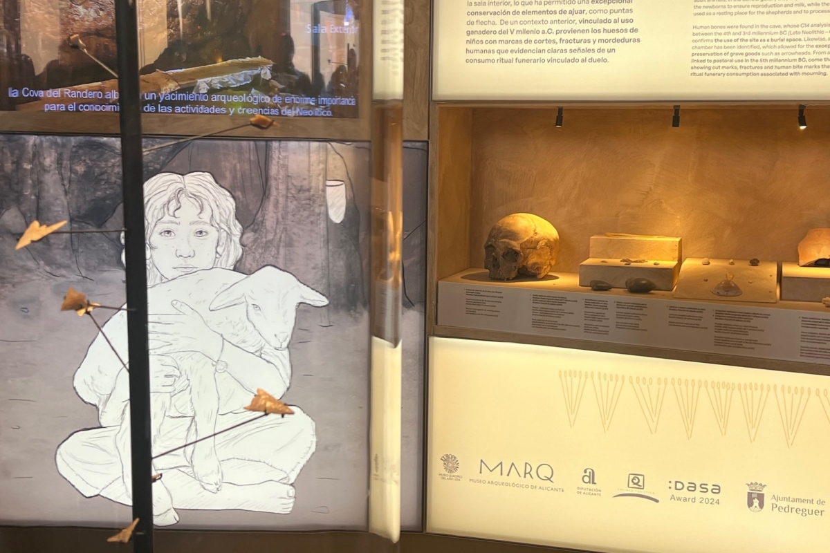 La muestra presenta de forma “didáctica y rigurosa” el contexto de los rituales practicados por pequeños grupos de pastores neolíticos que ocuparon la cueva en distintas fases, tal y como explicaba durante la presentación Consuelo Roca de Togores. Una exposición que sintetiza los resultados de casi veinte años de investigaciones arqueológicas desarrolladas en la Cova del Randero, desde 2007 hasta 2021, a lo largo de catorce campañas de excavación impulsadas por el MARQ. Así, en una primera etapa, durante el Neolítico medio, la cavidad fue utilizada como refugio estacional para el ganado y como espacio de procesado de carne. Sin embargo, en el Neolítico final, entre el IV y el III milenio antes de Cristo, la cueva adquirió un uso funerario, vinculado a complejas creencias sobre la muerte y el duelo.