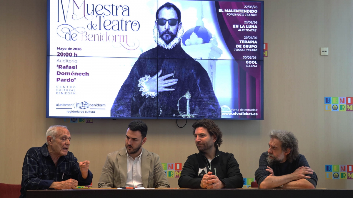 BENIDORM. La Concejalía de Cultura del Ayuntamiento de Benidorm ha presentado este miércoles la cuarta edición de la Muestra de Teatro, que se desarrollará el próximo mes de mayo en el Centro Cultural y que contará con cuatro representaciones a cargo de una compañía de teatro profesional y tres amateurs, compuestas por vecinos de Benidorm y de otras localidades de la Marina Baixa. El concejal del área, Jaime Jesús Pérez, ha estado acompañado en la presentación por representantes de estas tres compañías locales, Foromutis Teatro, Alpí Teatre y Tossal Teatre, que han ofrecido algunas pinceladas de los textos que pondrán en escena y han agradecido el “impulso” municipal a este evento, que representa “una gran oportunidad” para los aficionados a las artes escénicas.