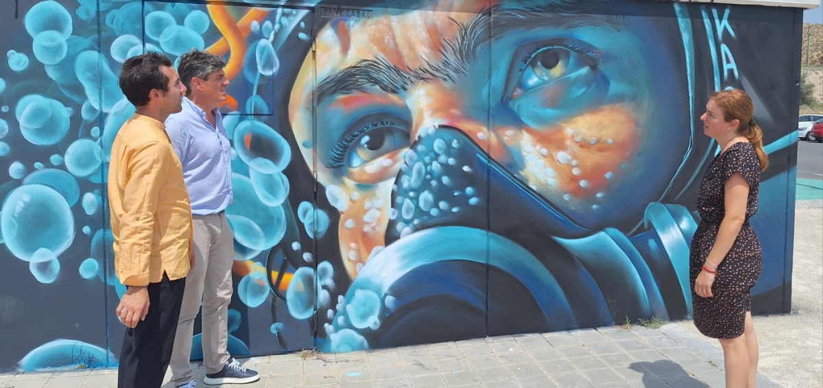 El alcalde Marcos Zaragoza, junto con los concejales de Cultura y de Juventud, Marisa Mingot y Carlos Soler, han visitado la obra de arte urbano. En esta edición, el lugar elegido ha sido dos casetas de servicios en el aparcamiento público de la playa del Paradís-Bol Nou. En concreto, un centro de transformación eléctrica y un centro de suministro de Hidraqua.