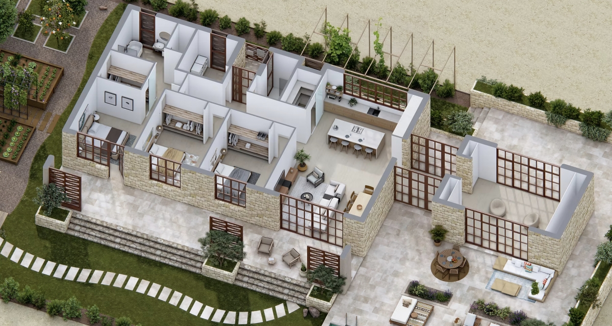 L’àmbit és el mateix de sempre: mig milió de metres quadrats a tocar de la làmina d’aigua del Beniarrés, amb el Mas Blau dins del perímetre, una alqueria avui abandonada que va passar a ser municipal arran dels acords urbanístics originals. El que es promet ara és «arquitectura d’alta eficiència» i “impacte mínim”. Però l’impacte real dependrà del nombre d’habitants, dels consums i, sobretot, del cicle hídrid d’un entorn mediterrani cada volta més tensat. Un dels referents esmentats al website és l’ecovillage de Serenbe, a Atlanta, on el preu de les cases ha superat el milió d’euros.