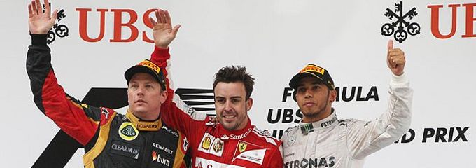 - Alonso en el centro acompañado de Raikkonen (2º) y Hamilton (3º)