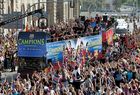 Los jugadores han correspondido la masiva presencia, y aún con fuerzas tras el gran esfuerzo de ayer, se han animado a bailar al ritmo de la música y de los coros de "campeones, campeones".