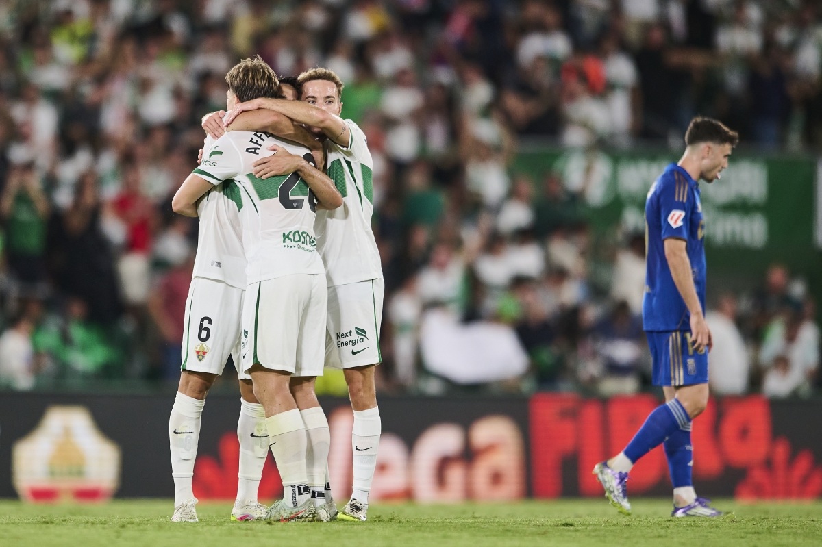 - Los jugadores del Elche CF celebran el gol de la victoria sobre el Real Oviedo