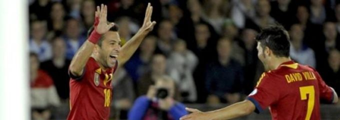 - Jordi Alba celebra el primer tanto español con Villa y Pedro / Foto: EFE