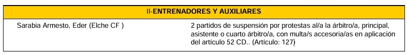 ALICANTE. El Comité de Disciplina Deportiva de la Real Federación Española de Fútbol (RFEF) ha decidido suspender por dos encuentros al técnico del Elche CF Eder Sarabia tras su expulsión en el choque del jueves en Pamplona.