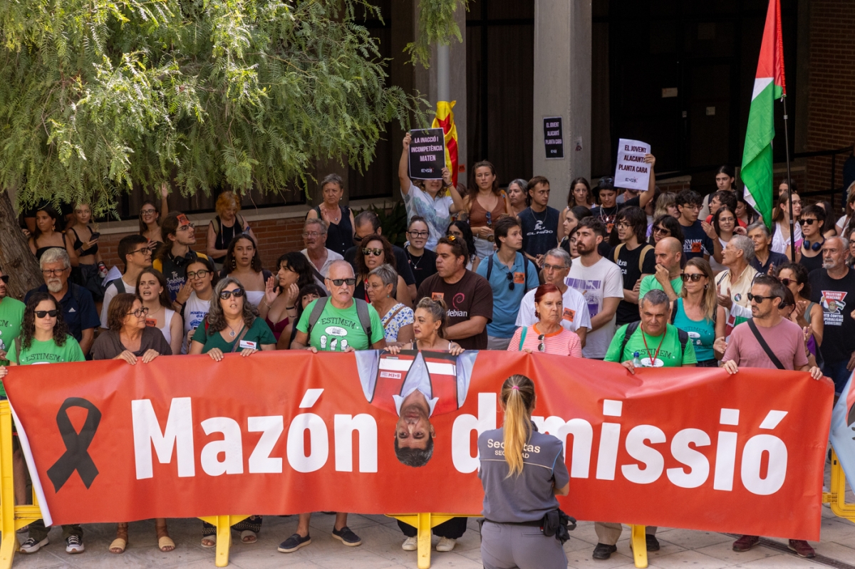 Una ruidosa concentración con una gran pancarta pidiendo la dimisión del president de la Generalitat Valenciana, Carlos Mazón, ha recibido a la comitiva académica que ha llegado al Paraninfo minutos antes de arrancar el solemne acto. Unas 150 personas, algunas con banderas palestinas, han gritado desde una hora antes del acto, que estaba previsto a las 12 horas aunque ha comenzado con unos minutos de retraso, sin que haya habido más incidentes con lemas como "Otra universidad es posible" y "Pública, gratuita y transformadora", así como protestas verbales en referencia a la dana de Valencia como "Ni iblit ni perdó, Mazón a presó" y "No són morts, són assassinats".