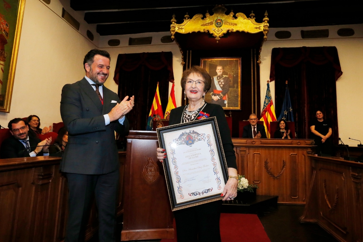 ELCHE. La locutora de radio Remedios Sanz Tendero ha recibido el nombramiento de Hija Adoptiva de Elche en un acto celebrado este jueves en el salón de plenos del Ayuntamiento, en reconocimiento y agradecimiento institucional a su extensa trayectoria profesional en el sector de la comunicación, a sus extraordinarios compromiso y vinculación con la sociedad ilicitana, implicación con las causas solidarias y destacada contribución a la defensa y a la promoción de nuestras tradiciones y símbolos de identidad más característicos.