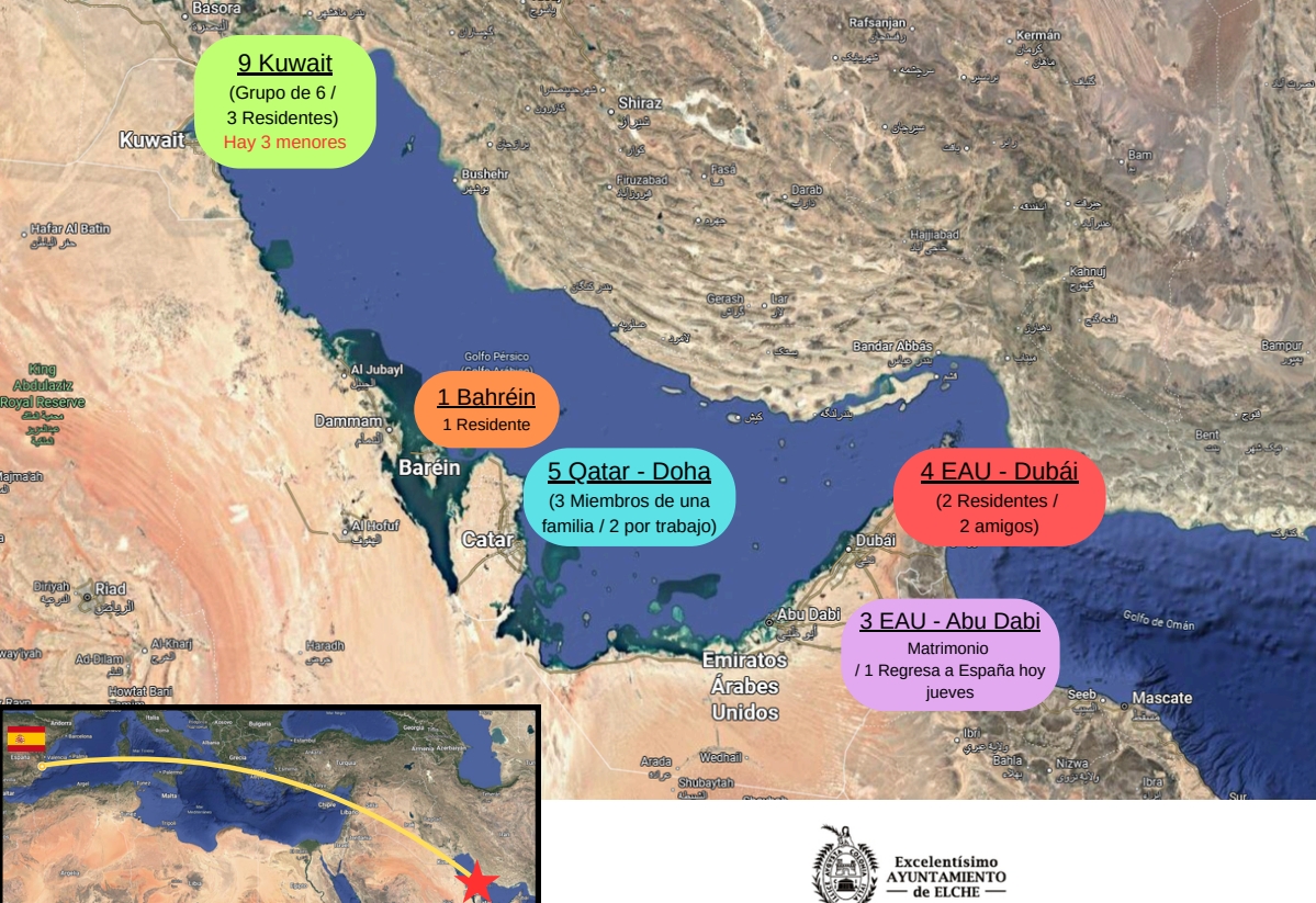 Por su parte, el alcalde Pablo Ruz explica que durante las últimas horas “hemos intensificado los contactos con las embajadas españolas y con la comisión creada por el Ministerio, pero las opciones que plantean, concretamente al grupo de ilicitanos en Kuwait, no son viables”. Señala que “no es razonable ni seguro atravesar 1.500 kilómetros de desierto con niños pequeños en medio de un conflicto armado. Nos parece una barbaridad y no es una alternativa”.