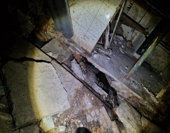 En es sentido, tras las visitas de inspecciones técnicas de 11 y 14 de abril de 2025, se apunta a nivel de cimentación a que "se han realizado catas en el suelo de la planta baja del edificio, en las zonas de los patios, observando que existe acumulación de aguas que confirma que el sistema de saneamiento del edificio (bajantes, arquetas y colectores de aguas residuales y pluviales) no funciona correctamente y que el terreno donde apoya la cimentación y la estructura del edificio no es actualmente estable, ya que no se considera que sea compacto ni firme y que ha disminuido su capacidad portante". También se indicaba la mala calidad del hormigón ciclópeo y la irregularidad en las dimensiones de las zapatas, tanto en planta como en canto.
