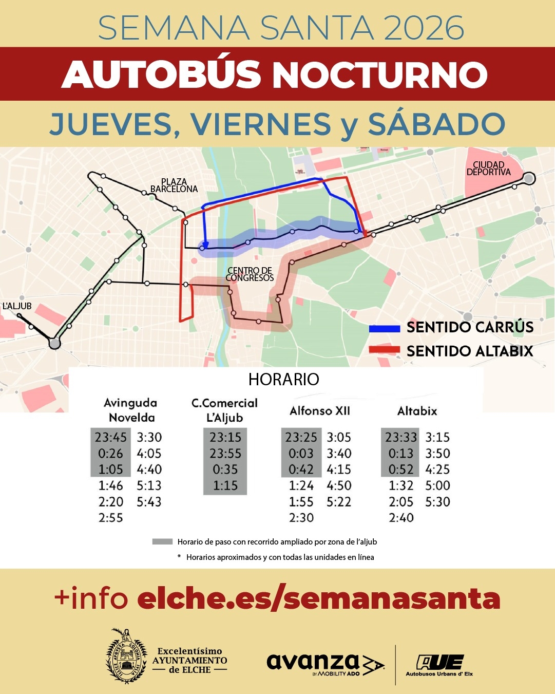 ELCHE. El edil de Movilidad, Claudio Guilabert ha anunciado esta mañana que el Ayuntamiento de Elche, de manera coordinada con la empresa concesionaria de los autobuses urbanos de Elche, va a poner a disposición de los ilicitanos un refuerzo del autobús nocturno, que se amplia a la noche de Jueves Santo.