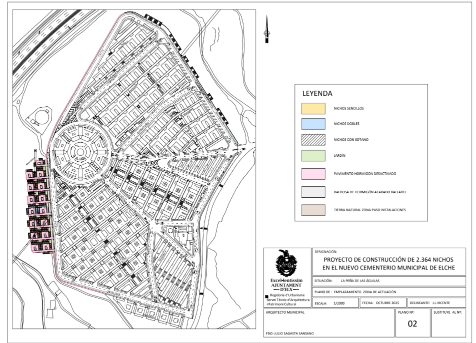 ELCHE. El Ayuntamiento de Elche activa la construcción de 2.364 nuevos nichos en el Cementerio de San Agatángelo con el objetivo de dar respuesta al déficit de espacio existente en los camposantos de la ciudad. La actuación, que se ejecutará por fases en un plazo aproximado de tres años, contará con una inversión de 6,1 millones de euros. El proyecto contempla la construcción de 2.212 nichos sencillos y 152 dobles en una parcela de alrededor de 6.700 metros cuadrados. La ampliación sustituirá el actual vallado de malla por los propios bloques de nichos, optimizando así al máximo el espacio disponible. Por tanto, se prevé el despliegue en un año más de lo previsto en el plan de contratación de este año.
