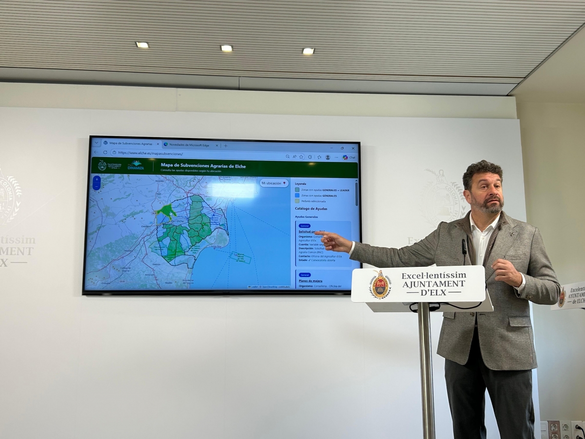 ELCHE. El Ayuntamiento de Elche, a través de la concejalía de Medio Ambiente, ha presentado un nuevo Mapa Interactivo de Subvenciones Agrarias, una nueva herramienta digital destinada a facilitar el acceso de los agricultores ilicitanos el acceso a las ayudas agrarias disponibles y mejorar la captación de fondos en el ámbito rural.