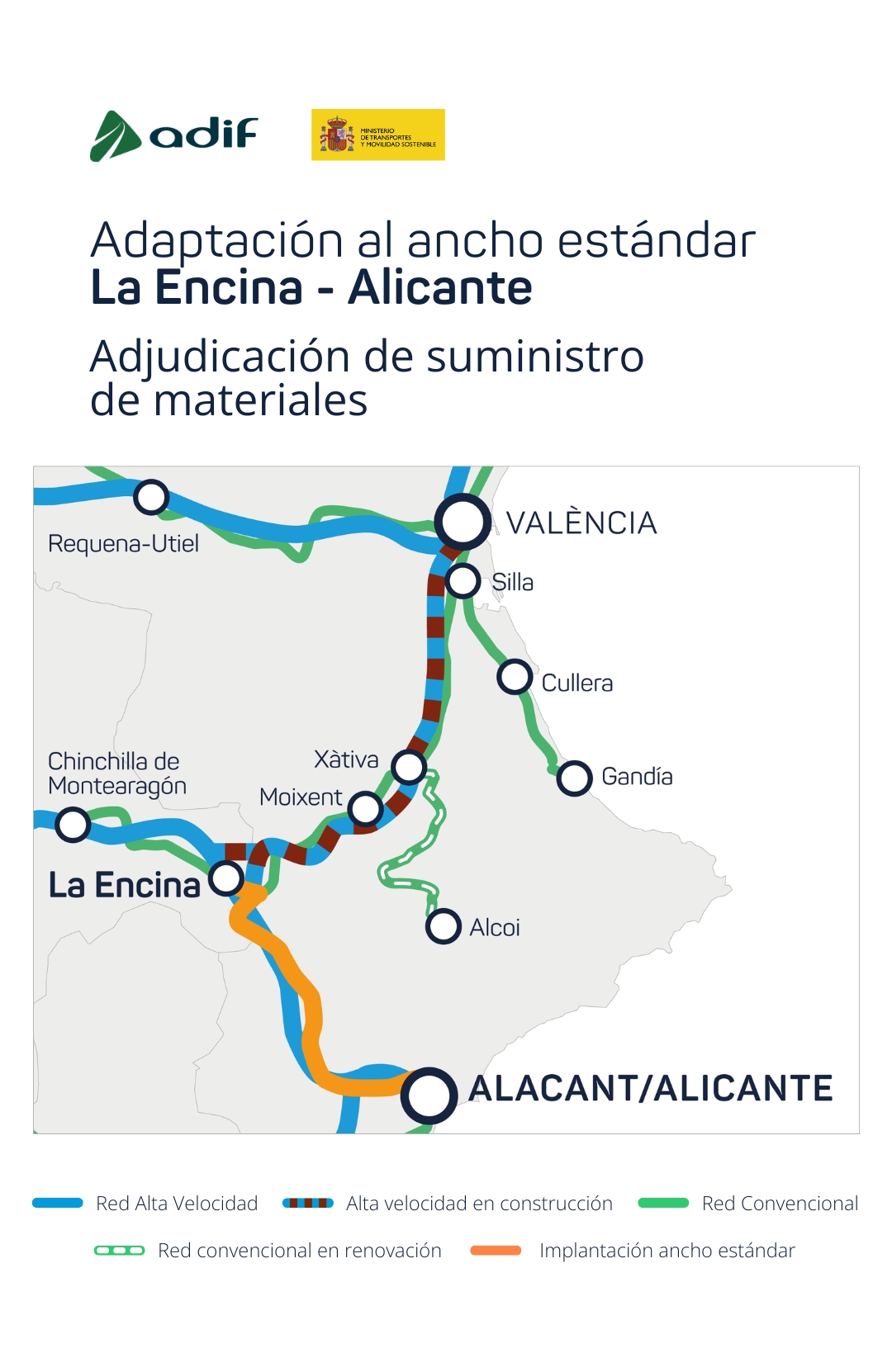 ALICANTE.- El Ministerio de Transportes y Movilidad Sostenible ha adjudicado, por un importe de 23,9 millones de euros y a través de Adif, el contrato para el transporte y suministro de nuevos materiales de vía destinados a la implantación del ancho estándar en el tramo La Encina‑Bifurcación de Alicante, una actuación clave dentro del desarrollo del Corredor Mediterráneo en la Comunitat Valenciana.