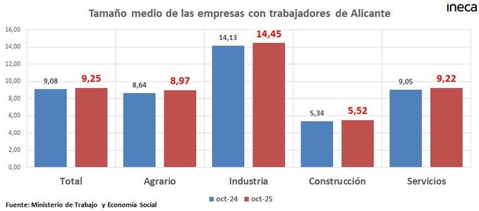 ALICANTE. El tamaño medio de las empresas con trabajadores de la provincia de Alicante en octubre fue de 9,25 personas trabajadoras para el conjunto de sectores, según el Instituto de Estudios Económicos de la Provincia de Alicante (Ineca), mejorando el dato de 2024 que era de 9,08. Esta mejora se produce en los sectores agrario, industrial, construcción y servicios. No obstante, según las mismas fuentes, "a pesar de esta mejora, la provincia de Alicante para el conjunto de actividades ocupa la posición 34º a nivel nacional en tamaño empresarial, y es una de las provincias con menor crecimiento en los últimos 12 meses, ocupando la posición 44 en aumento porcentual y en dato absoluto.
