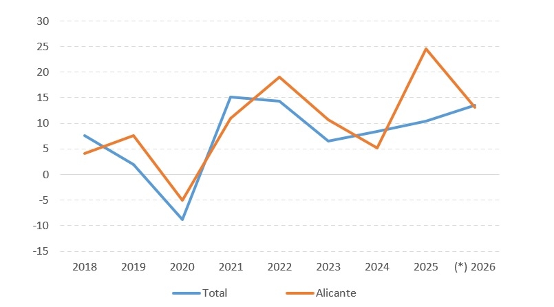 - Tasa de crecimiento anual de la recaudación tributaria en Alicante en 2025 y 2026 hasta febrero. Fuente: AEAT