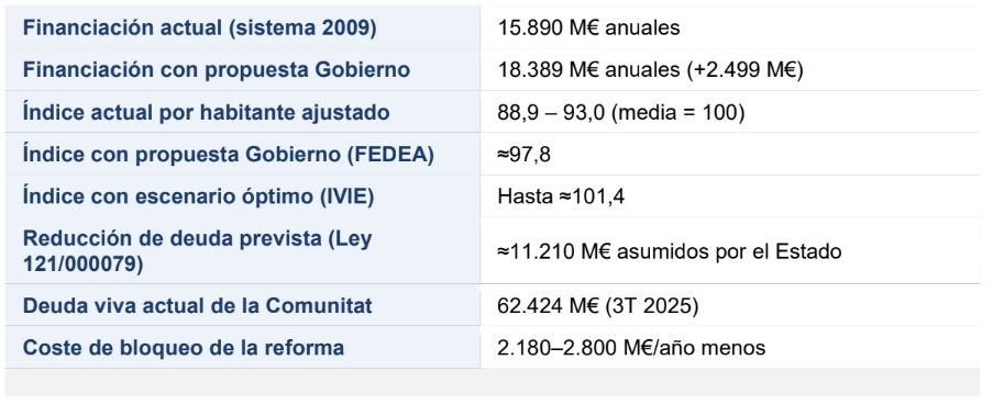 Ineca reconoce que la propuesta de reforma del Gobierno, y el Proyecto de Ley Orgánica 121/000079, supone "el primer movimiento real hacia la corrección de esta injusticia". Llopis indica que el análisis de Fedea (De la Fuente, 2026) y del IVIE (Pérez, 2025) estima que la reforma generaría para la Comunitat Valenciana un incremento neto de aproximadamente 2.499 millones de euros anuales, elevando su índice de financiación desde el entorno del 89 hasta aproximadamente 97,8. En el escenario óptimo del IVIE, incorporando el reconocimiento del esfuerzo fiscal relativo, el índice podría alcanzar 101,4 y el incremento de recursos llegar hasta los 2.500 millones anuales.