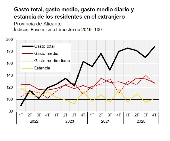 ALICANTE.- La provincia de Alicante volvió a batir récords turísticos en 2025. El último informe sectorial del Gabinete de Estudios de la Cámara de Comercio confirma que el sector alcanzó máximos históricos en llegada de visitantes, gasto turístico y actividad económica, impulsado por la recuperación de las economías europeas, el aumento de la renta disponible de los hogares y la moderación del precio del petróleo. A ello se suma un factor geopolítico: la inestabilidad en Oriente Medio, que ha desviado parte de la demanda hacia destinos mediterráneos más seguros como la Costa Blanca. Ahora bien, hay un handicap que puede generar algún freno: el aumento del precio de los carburantes, y por tanto, del transporte, que puede incrementar el precio de los billetes y de los paquetes turísticos.