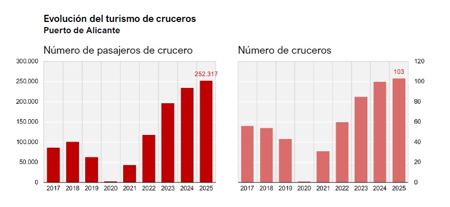 Las previsiones para 2026 son optimistas. La mejora de la renta disponible en Europa, la estabilidad de los tipos de interés, la apreciación del euro y la moderación del precio del petróleo anticipan un nuevo año de crecimiento. Además, el puerto de Alicante prevé 113 escalas y más de 320.000 cruceristas, lo que elevaría el impacto económico del sector hasta los 84 millones de euros.