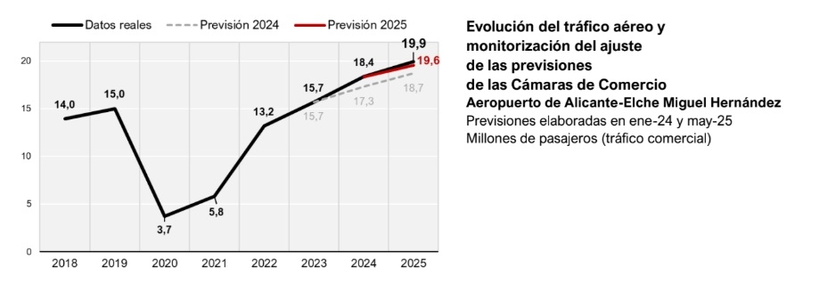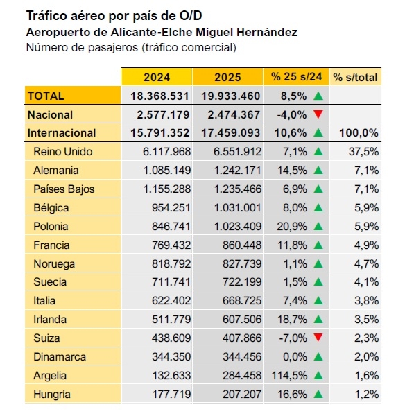 El aeropuerto Alicante-Elche Miguel Hernández cerró el año con 19,9 millones de pasajeros, un 8,5% más, impulsado por el tráfico internacional y la apertura de nuevas rutas, especialmente con Reino Unido y Europa del Este. Ryanair mantuvo su liderazgo con el 41% del mercado.