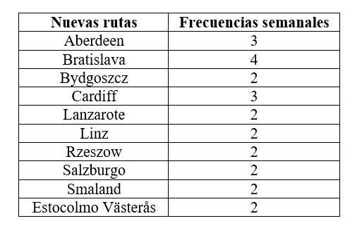 Así, la temporada contará con 79 rutas, con diez nueos destinos como Bratislava (Eslovaquia); Linz y Salzburgo (Austria); Bydgoszcz y Rzeszow (Polonia); Cardiff y Aberdeen (En Gales y Escocia, en el reino Unido); Estocolmo, Västeras y Smaland (Suecia) y Lanzarote, además de más frecuencias en destinos con afluencia como Milán, Marrakech, Budapest, Edimburgo y otras. Según Ruiz, las nuevas rutas y frecuencias adicionales permitirán a Ryanair aumntar su capacidad en la época invernal en la provincia alicantina un 12%.