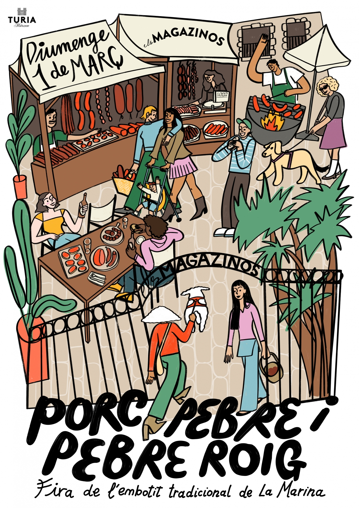Magazinos estrena su agenda de ferias gastronómicas 2026 el próximo domingo 1 de marzo con la tercera edición de la Feria del embutido tradicional de la Marina Alta “Porc, Pebre i Pebre Roig”. Una llamada a disfrutar de la vida, plasmada en el cartel creado por la artista valenciana África Pitarch.