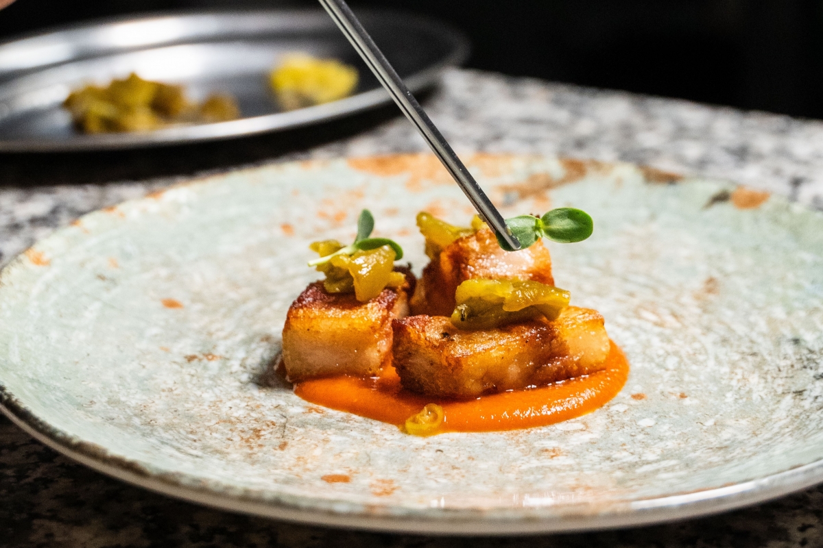 Fueron trece años intensos de aprendizaje y exigencia, pero también de desgaste. “Era como llevar tres restaurantes a la vez: el gastronómico, los eventos y las bodas”, recuerda el cocinero. “El sábado por la mañana estás emplatando fino y por la tarde tienes que dar de comer a 150 personas; yo quería volver al detalle, a cocinar gastronómico”, justifica. Así que en Tábula Rasa hizo borrón y cuenta nueva, de ahí la elección del nombre del establecimiento, basándose en ese término del derecho romano. Y es que no fue solo un nombre propio lo que escogió, sino que fue una declaración vital. Un corte limpio con una etapa y la posibilidad de construir algo suyo, sin intermediarios ni concesiones.