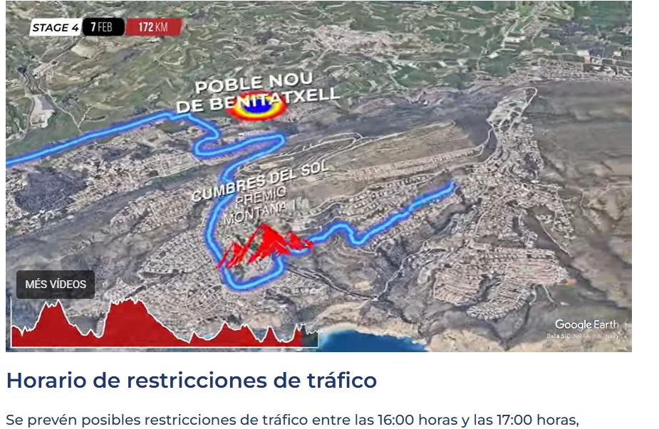 La Vuelta a la Comunitat Valenciana pasará por el municipio el próximo sábado 7 de febrero, entre las 16:45 y las 17:15 h (aunque el tráfico estará restringido a partir de las 16 h), por Cumbre del Sol y las calles Assegador, Pou, Mayor, la Pau y la avenida de Alicante. La etapa dará inicio a las 12:30 h en La Nucia y seguirá hasta la Marina Alta, donde pasará por municipios vecinos como Parcent, Orba, Tormos, Sagra, Pego y Les Valls, Beniarbeig, Pedreguer, Alcalalí, Xaló, Calp, Benissa y Teulada Moraira, donde estará la meta.