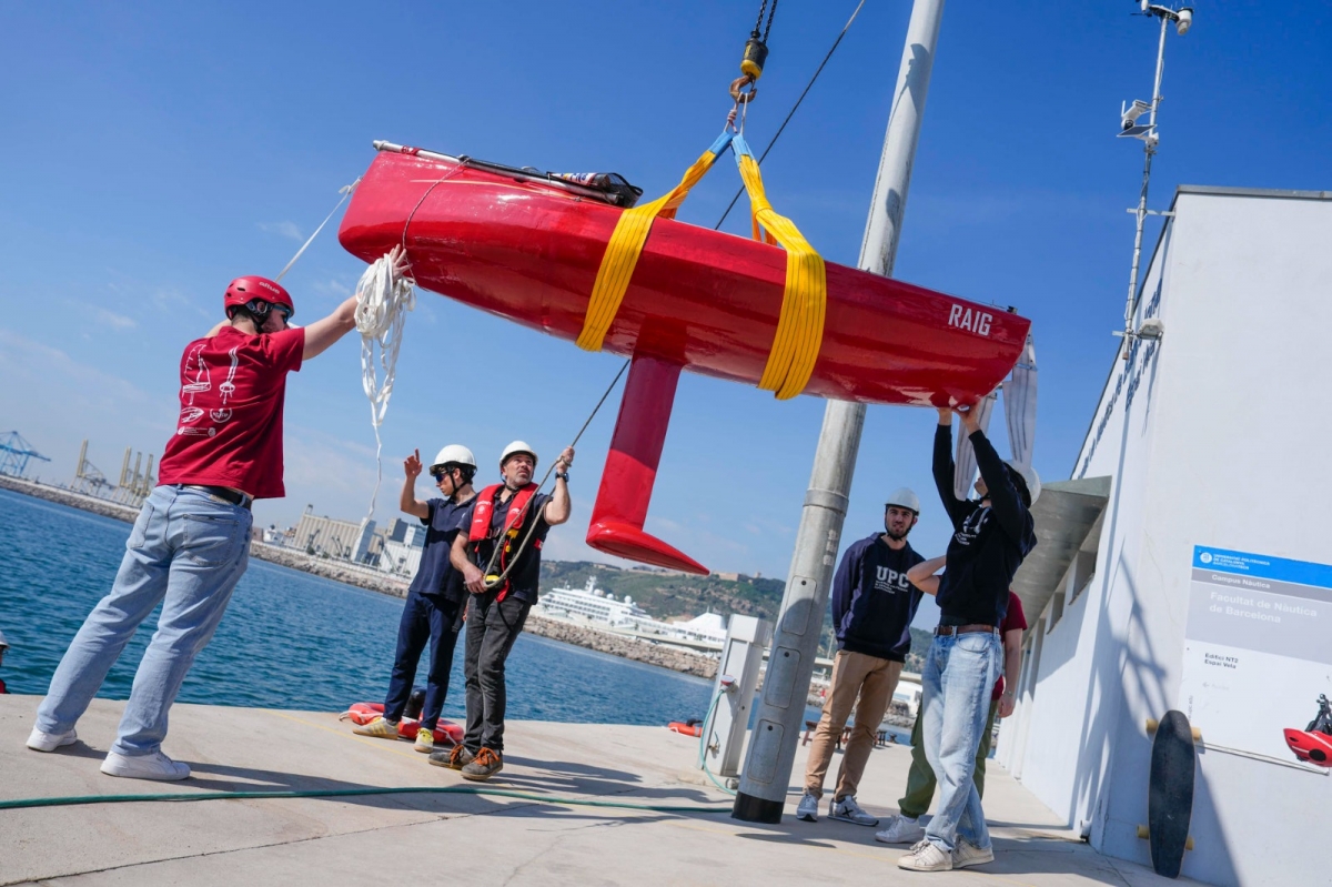 Una veintena de estudiantes de la Facultad de Náutica de Barcelona (FNB), de la Universidad Politécnica de Cataluña (UPC), han trabajado durante los últimos nueve meses en el diseño y la fabricación de este velero autónomo sostenible, bautizado como Raig FNB.