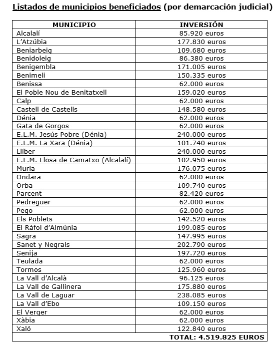 ALICANTE. (EFE).- La Diputación de Alicante inyectará 4,5 millones de euros en 33 de municipios y tres entidades locales menores de la Marina Alta a través del Plan +Cerca, una aportación que beneficiará a una población cercana a los 200.000 habitantes.