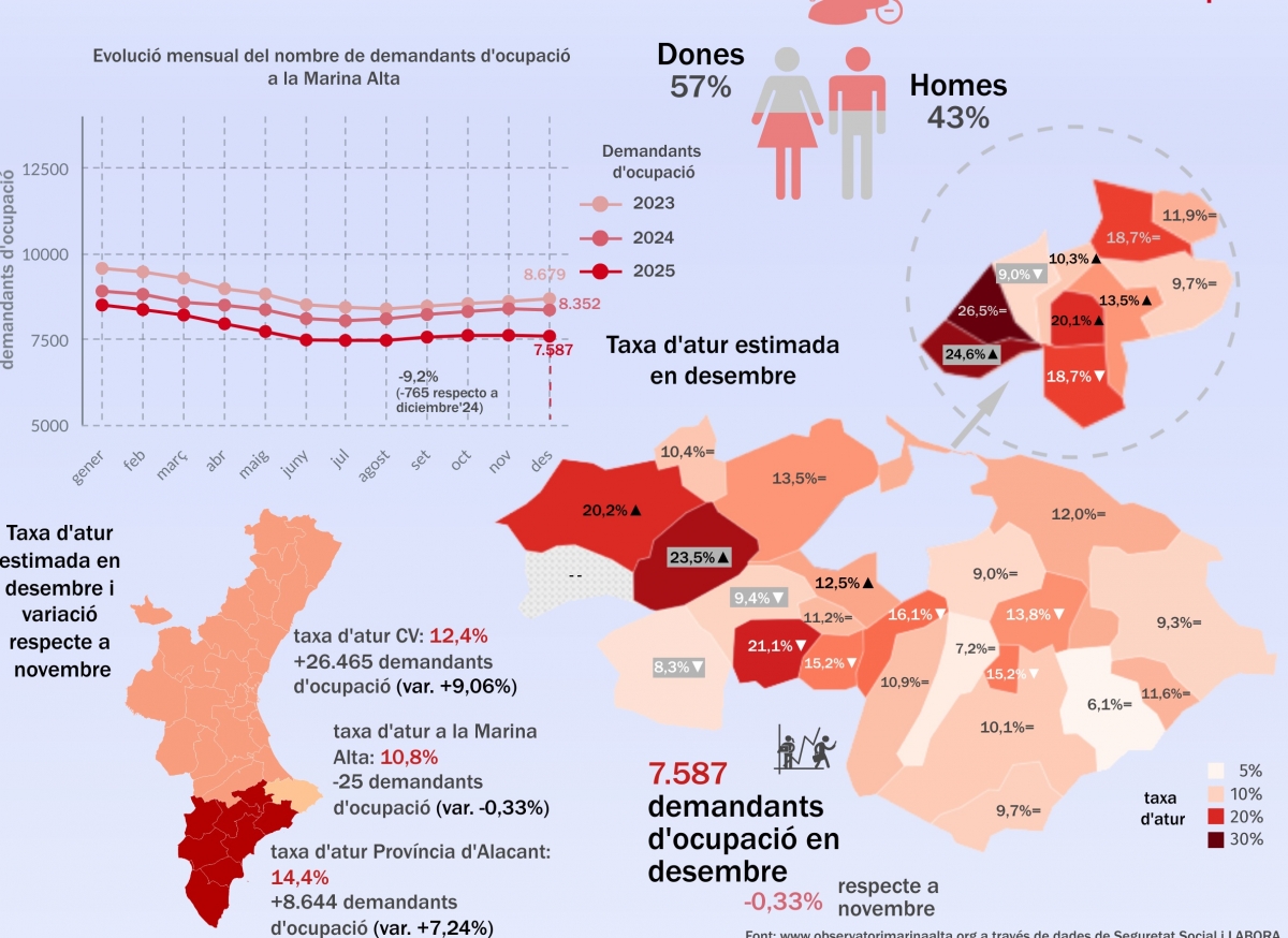 Según los datos del Observatori Marina Alta de CREAMA y PACTE’MA —proyecto subvencionado por LABORA Servicio Valenciano de Empleo y Formación y por el Ministerio de Trabajo y Economía Social, dentro del programa AVALEM TERRITORI de la Generalitat Valenciana—, la Marina Alta mantiene una tasa de paro estable, situada en el 10,76%, inferior a la de diciembre de 2024 (12,03%) y por debajo de la media de la provincia de Alicante y de la Comunitat Valenciana.